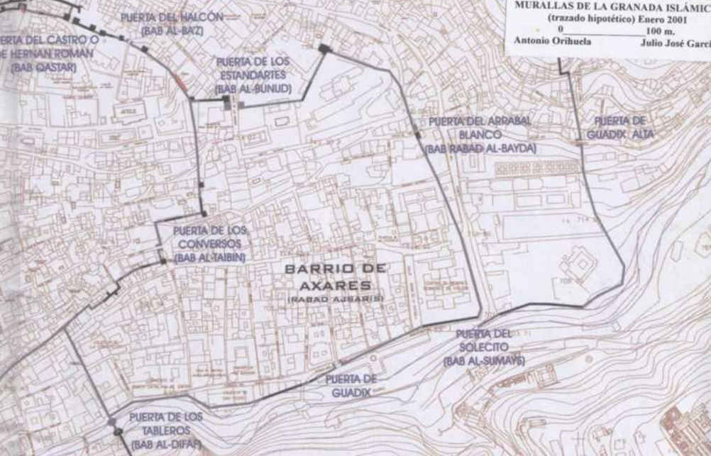 En los estudios sobre las murallas de la Granada islámica, así como en las planimetrías sobre el hipotético trazado de las mismas aparece reflejado el tramo que cerraría la Cuesta del Chapiz y bajaría paralelo por el Paseo de los Tristes hasta la puerta de Guadix continúando hasta el Bañuelo (Fig. 8 y 9). Este tramo se consideraba desaparecido ya que las fuentes hablan de su de-