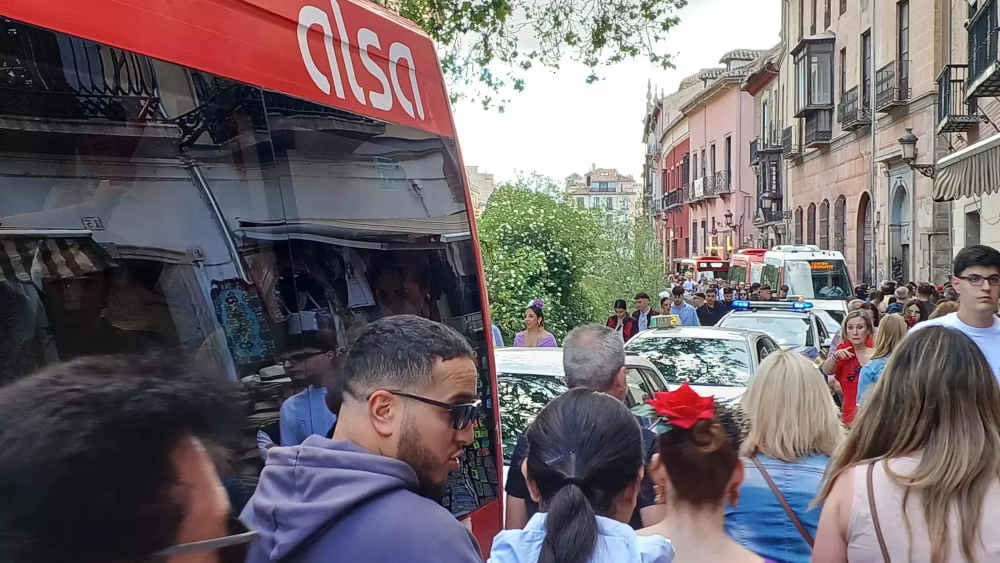 En esa esquina que se estrecha, además, había dos personas con movilidad reducida en silla de ruedas que llevaban, según denunciaban, media hora para poder pasar. Los escalones que se abren en ese punto impedían que siguieran por la acera y tenían que pasar por la calzada. Pero los peatones, en masa, se colaban entre ellas y los vehículos cuando se podía y cuando no eran los coches los que impedían el paso. La gente se tenía que pegar a los edificios y muchos optaban por subirse al pretil del Darro, lo que generaba momentos de peligro. El comentario general: «Qué vergüenza, como está la calle. Un día así es increíble que se deje abierto el tráfico». En cruzar la calle entera se tardó unos 20 minutos sorteando coches y autobuses.