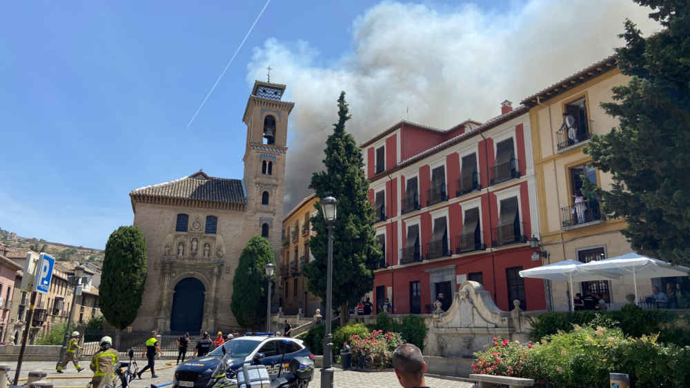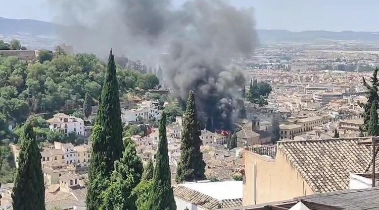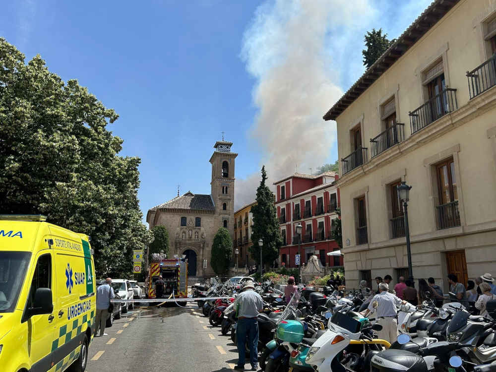 Un incendio declarado este mediodía en un inmueble junto a Santa Ana que, según los vecinos de la zona, ha estado okupado, ha obligado a desplegar un amplio operativo de emergencias para evitar su propagación. En pleno corazón de la ciudad, junto a Plaza Nueva y en las inmediaciones del bosque de la Alhambra, la actuación de las emergencias ha sido clave para controlarlo sin que haya ocasionado, según los primeros datos, daños personales y tampoco al patrimonio del entorno, donde preocupaba especialmente la Iglesia de Santa Ana.