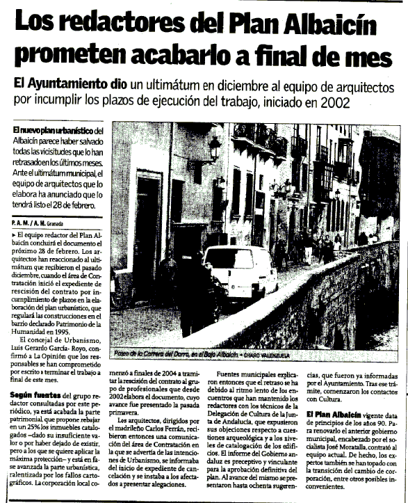[PRENSA] Los redactores del Plan Albaicín prometen acabarlo a final de mes [20 febrero de 2005]