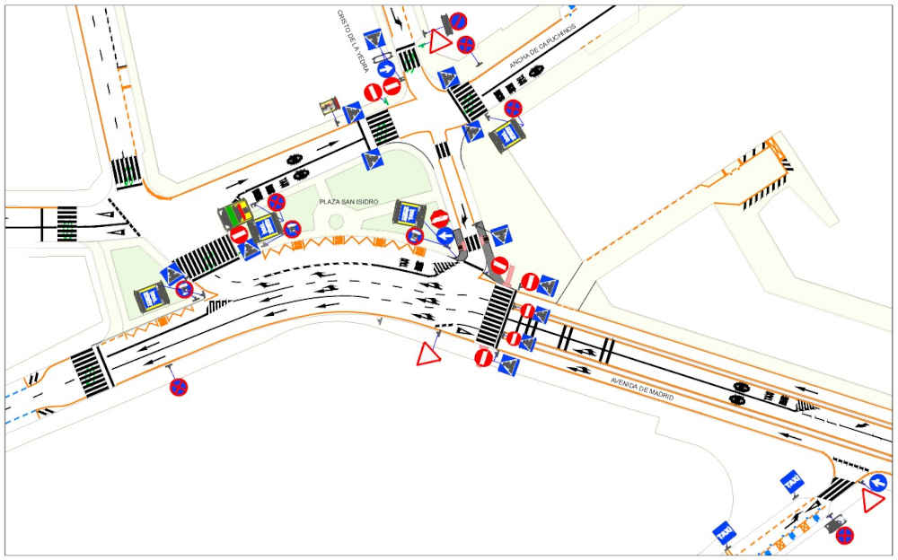 – Se favorece la incorporación directa al carril derecho de Pza. San Isidro a los vehículos que acceden desde la calzada situada en el lateral derecho de la Avda. de Madrid restringiendo a un solo carril la salida de vehículos del paso inferior donde, para favorecer la incorporación de los vehículos del transporte público, se reserva el carril derecho de salida del subterráneo.