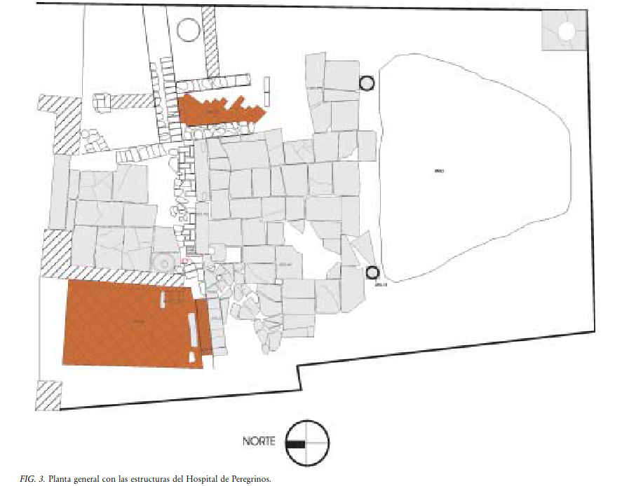 La excavación arqueológica ejecutada en el solar ubicado en la calle Calderería Nueva nº 6 se documentaron los restos del edificio del antiguo Hospital de Peregrinos de Granada (siglos XVI-XVIII) construido sobre los restos de la trama urbana nazarí, constatando las profundas transformaciones de la zona tras la conquista castellana y recuperando un importante volumen de elementos arquitectónicos pertenecientes a la fábrica del antiguo hospital, fechados en el siglo XVII.