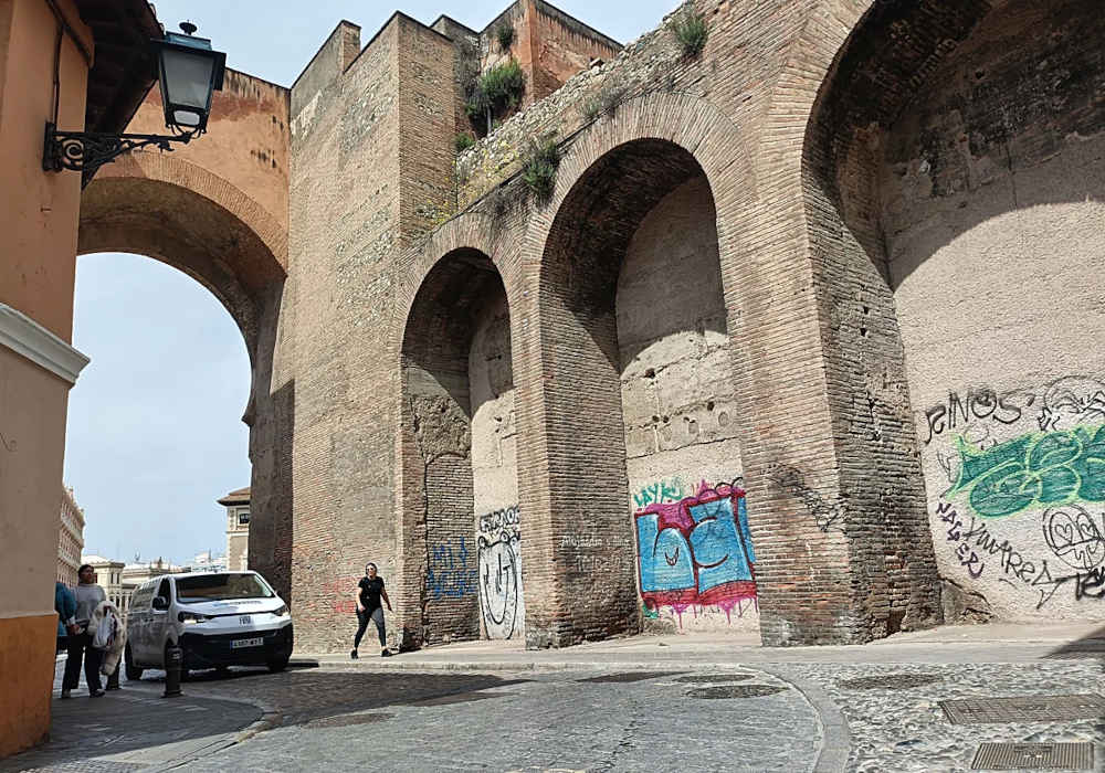 Justo antes de cruzar el arco, hay una pintada en color naranja fosforito que dice: «No necesitas pareja». No es la única. Al otro lado hay unas letras negras gigantescas. Pero lo peor no llega hasta que se adentra en la propia calle Elvira. Los tres arcos consecutivos están completamente pintarrajeados, con lo que el milenario monumento ofrece una imagen lamentable, de descuido y se convierte en el peor ejemplo de conservación posible, como denuncia la asociación de vecinos del Albaicín.