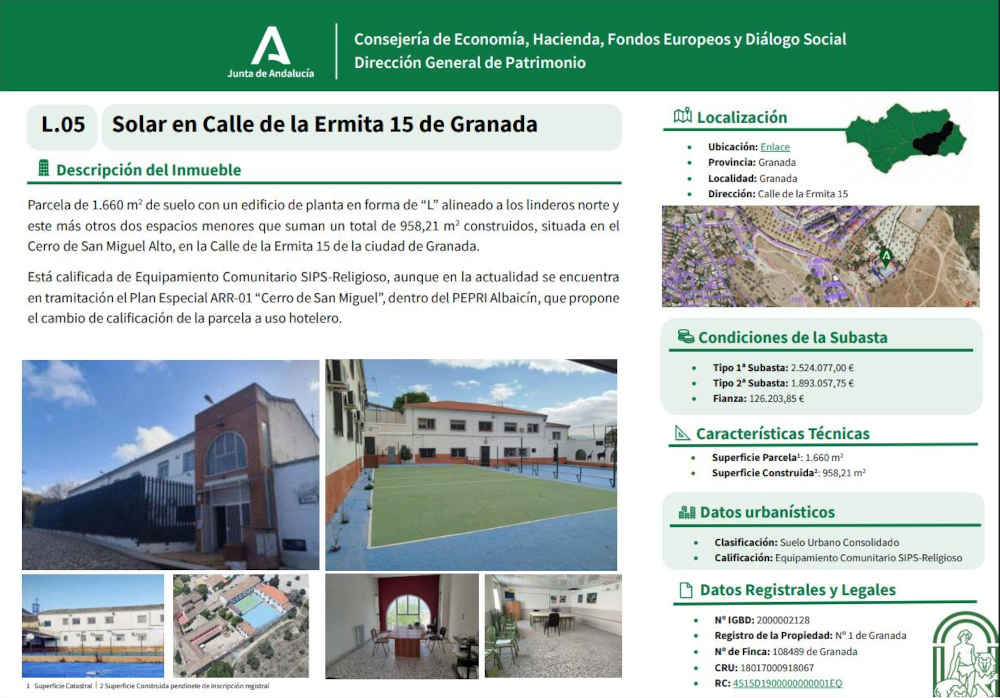 Como el mismo pliego de condiciones que publica la Junta de Andalucía establece, se trata de una parcela de 1.660 m2 de suelo con un edificio de planta en forma de “L” alineado a los linderos norte y este más otros dos espacios menores que suman un total de 958,21 m2 construidos, situada en el Cerro de San Miguel Alto, en la Calle de la Ermita 15 de la ciudad de Granada.