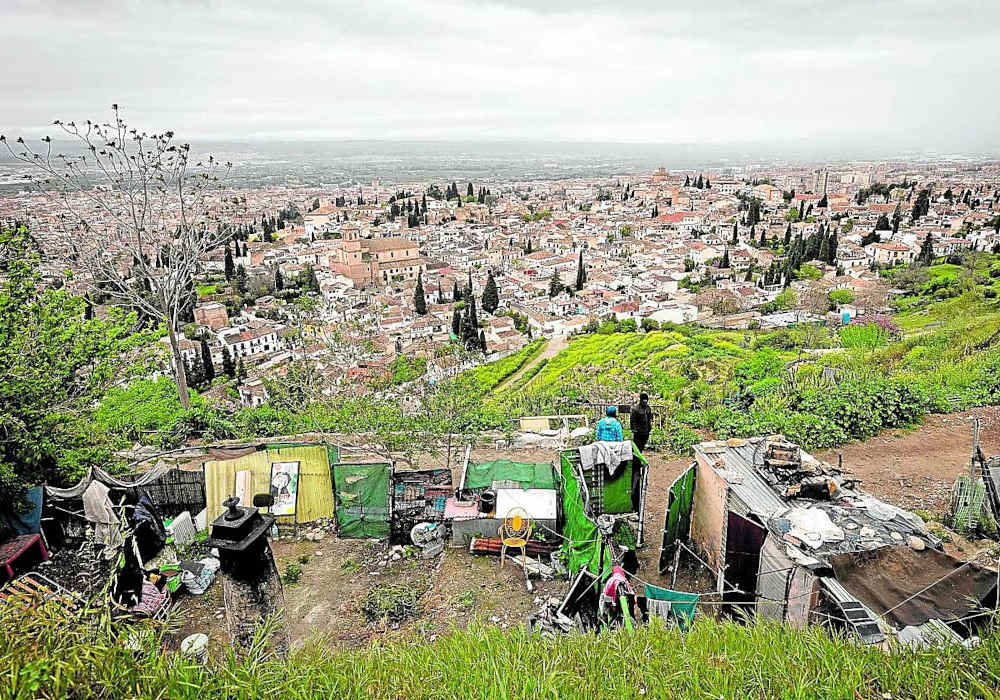 Miércoles lluvioso, con pocos transeúntes. Subir a San Miguel se ha puesto de moda en los últimos años por sus impresionantes vistas de la ciudad. Si hay calima, es el mejor sitio para divisarla, pero la puesta de sol es un espectáculo que ya se ha hecho viral hace tiempo. Pero la estampa que ofrece el cerro es variopinta y cada vez más degradado. Un camino de tierra con baches da acceso al antiguo centro de menores, que está cerrado. La ermita se restauró, pero es pasto de las pintadas con frecuencia, al igual que las murallas. Y en la ladera que baja se mezclan cuevas pintorescas, algunas antiguas, con otras que son infraviviendas y que han sido pasto de las llamas también en alguna ocasión. Una amalgama de viejas uralitas, colchones y residuos se mezclan en otros puntos, que casi parecen chabolas. Eso sí, con las mejores vistas de Granada. En este pasado miércoles lluvioso había poca presencia humana, pero la estampa no parece que se haya mejorado en los últimos años. Incluso coches, que parecen abandonados, están parados en el entorno. Algún cartel anuncia que, en alguna de huecos del monte, se venden bebidas.