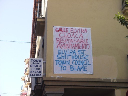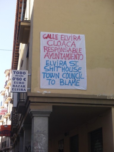 La pancarta colocada en este bloque de la calle Elvira es un ejemplo de la situación que se vive en esta calle tan importante del barrio y de Granada, y toda su zona. Las pintadas que ensucian todas las fachadas, puertas,... in respetar nada, y que minutos después de limpiarlas vuelven a ponerse; la presencia de vagabundos y perros llenándolo todo de mugre, bebidas que derraman, orines, excrementos, basuras,... que en muchas ocasiones te impiden acceder a tu propia vivienda; el botellón y la movida todos los días de la semana con sus ruidos, algaradas, suciedad,...que te impiden el descanso; el tráfico que se deriva de Gran Vía para acceder al aparcamiento o al centro hace intransitable una calle que se hizo sin aceras pensando en su carácter semipeatonal,... Se comprende la desesperación de los vecinos, muchos de los cuales se han marchado, otros han sido expulsados para reconvertir los pisos en apartamentitos, y los que resisten, cada vez menos, deben soportar este lodazal.